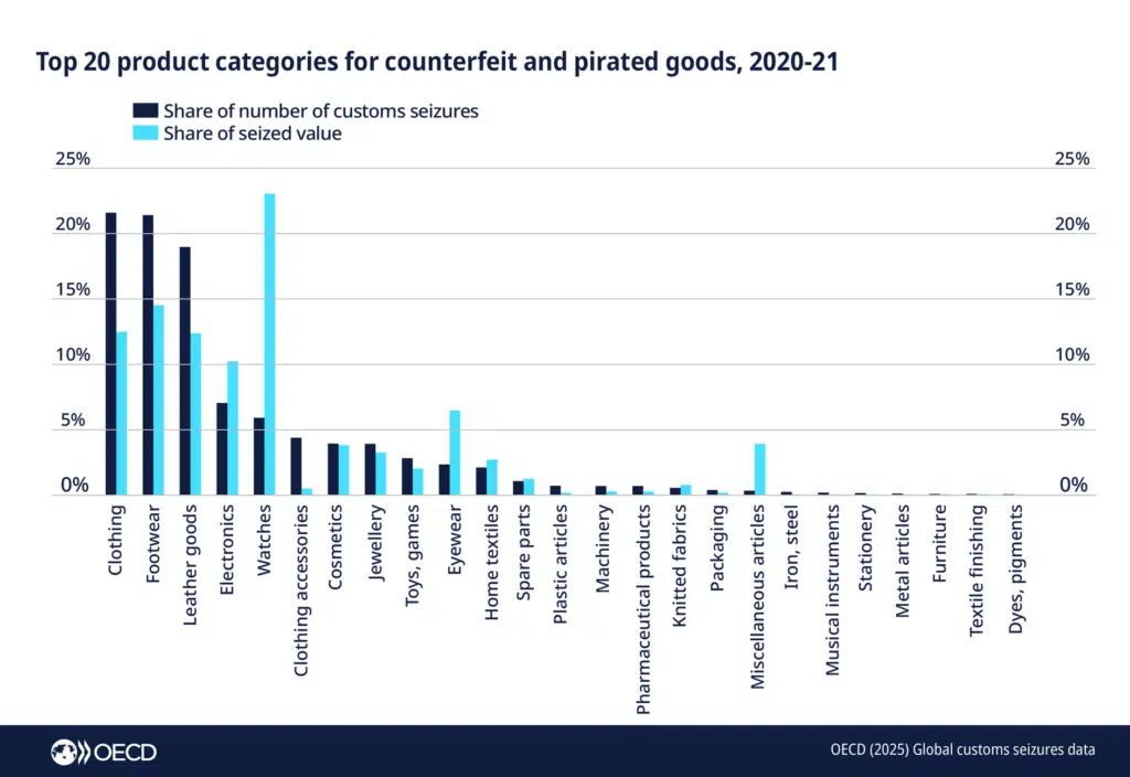 Within that market, fashion and luxury goods remain central. Apparel, footwear, and leather goods, including handbags, account for the majority of counterfeit items seized globally, representing roughly 62 percent of total volume. Footwear leads in the number of cases, followed by clothing and accessories. Watches, while fewer in quantity, account for a disproportionately large share of total value, reflecting their higher price points.