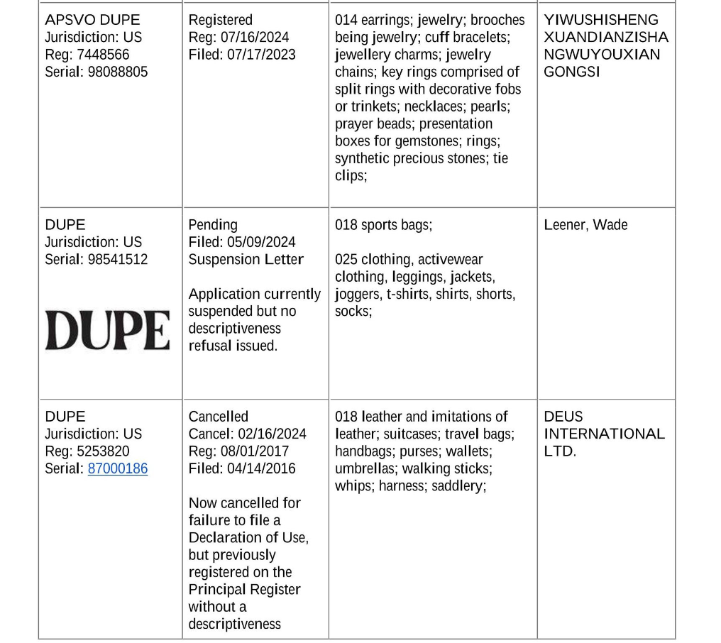 Aritzia bolsters its argument with precedent from the USPTO’s own register. The company points to numerous third-party registrations for marks containing the word “DUPE” – for use on goods/services like apparel, accessories, and retail services – registered without disclaimers or claims of acquired distinctiveness.