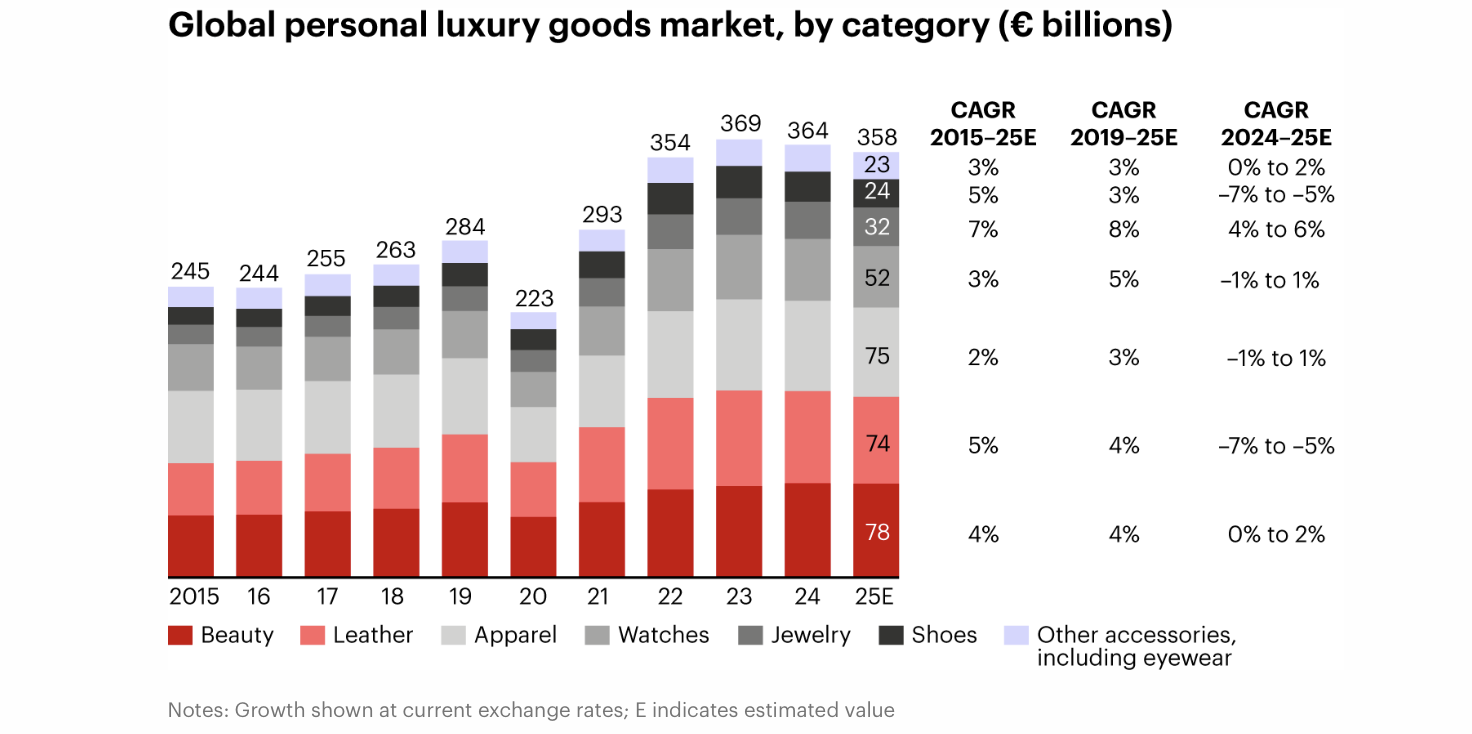 > Personal luxury goods held steady – but fragile: Core personal luxury goods slipped about 2% to €358 billion, flat at constant exchange rates, with modest improvement in the second half of the year.
