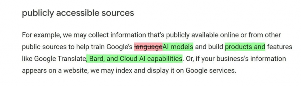 – Timing: The timing of the lawsuit follows closely from Google’s move to “quietly ‘update’ its online privacy policy [on July 1] to double-down on its position that everything on the internet is fair game for the company to take for private gain and commercial use, including to build and enhance AI products like Bard.” Moreover, they assert that “Google’s sudden notice and admission regarding its scraping practices to build Bard and other AI products came only three days after its competitor OpenAI was sued for theft and commercial misappropriation of personal data on the internet, as part of its own massive ‘scraping’ operation, also done in secret, without notice of consent from anyone whose personal information was taken. “