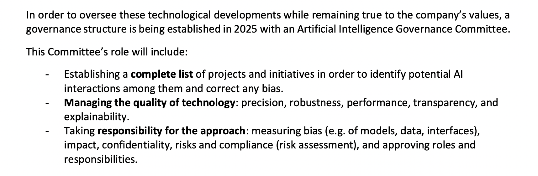 Hermès announced the formation of an Artificial Intelligence Governance Committee in 2025, tasked with overseeing model accuracy, transparency, ethical risks, and regulatory compliance. It also disclosed that it is monitoring the environmental impact of AI systems indirectly via its cloud usage, and that social and ethical training is being introduced to minimize bias and support employee adoption.