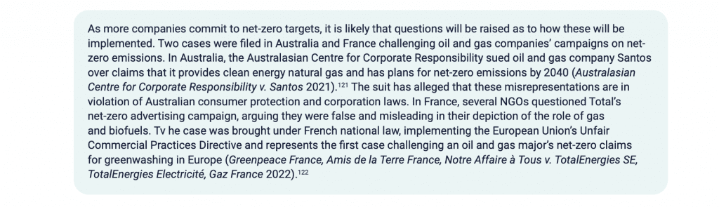 Climate disclosures: These cases involve plaintiffs bringing suits against companies claiming that they relied on their statements to make financial decisions, as well as cases brought by governments enforcing securities disclosures and consumer protection laws, and NGOs challenging alleged greenwashing or climate-washing campaigns. “Investors continue to file suits alleging that public disclosures relating to climate risk were misleading or fraudulent, both in relation to the risk that a transition away from fossil fuels poses to their business or investment assets and the risk of physical impacts to infrastructure, operations and supply chains associated with climate change.” In short, these cases are usually grounded in national consumer protection or corporate laws.