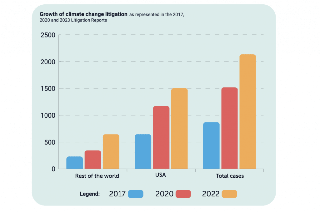 Climate change-related lawsuits are on the rise. The total number of lawsuits that center on climate change has more than doubled since 2017 and the number of newly-initiated cases is growing on a global scale, according to a recent report from the United Nations. Based on a review of cases focused on climate change law, policy, or science collected up until December 31, 2022, the UN Environment Program (“UNEP”) and the Sabin Center for Climate Change Law at Columbia University report that 2,180 climate cases was initiated in 2022, up from 884 in 2017. In their joint “Global Climate Litigation Report: 2023 Status Review,” UNEP and the Sabin Center stated that such rising figures demonstrate that climate litigation is becoming “an integral part of securing climate action and justice.”