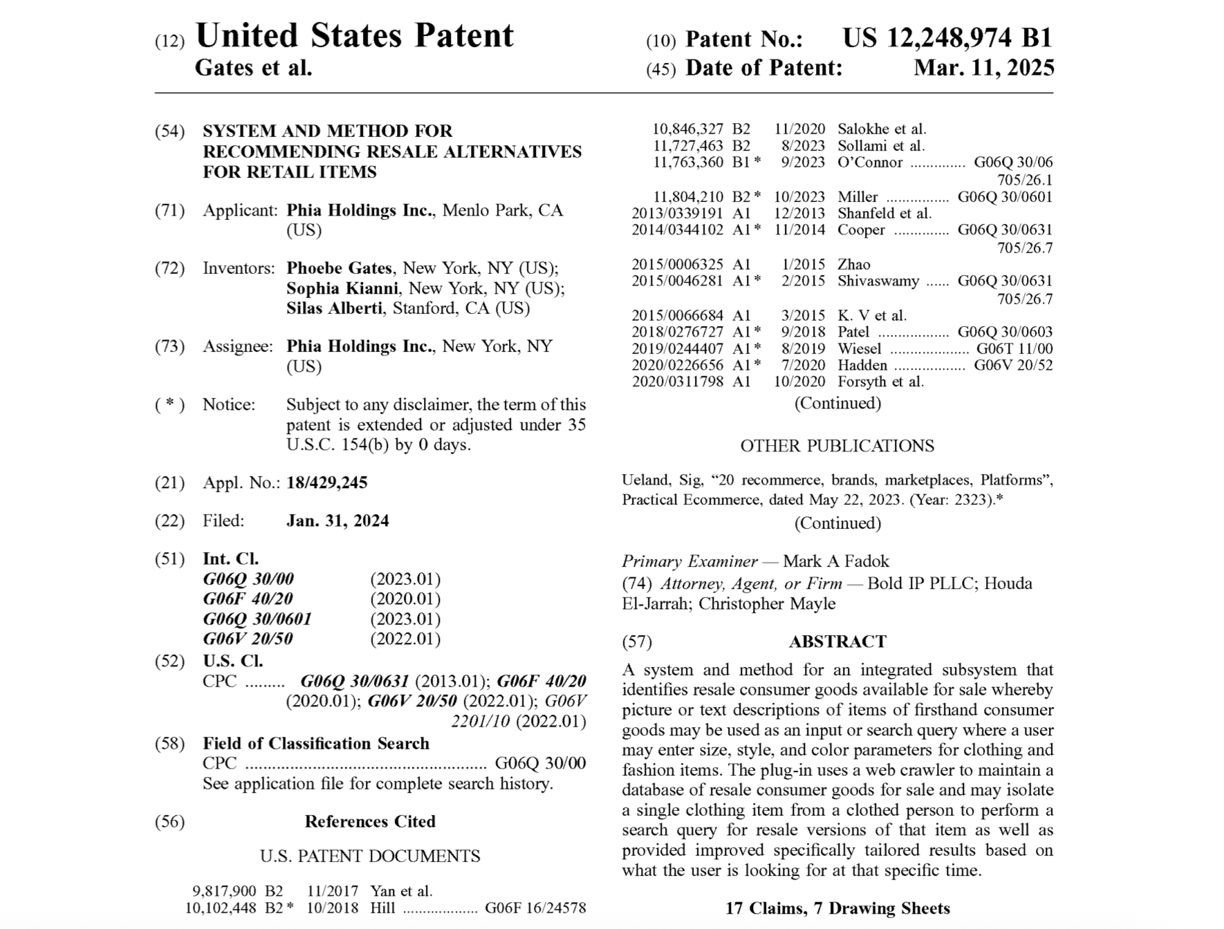 The Background in Brief: At launch on April 24, Phia says that integrates with more than 40,000 online shopping sites – from Louis Vuitton and Nike’s e-commerce sites to resale platforms like The RealReal, eBay, StockX, and Poshmark, to instantly analyzes pricing, labeling each item as high, typical, or fair. When Phia detects that an overpriced item, it surfaces lower-priced exact matches or similar alternatives, including from resale sites. The app is powered by a patent-protected “system and method for recommending resale alternatives for retail items.” The patent was registered by the U.S. Patent and Trademark Office on Match 11, and names Gate, Kianni, and Silas Alberti, a PhD student in AI at Stanford, as inventors.