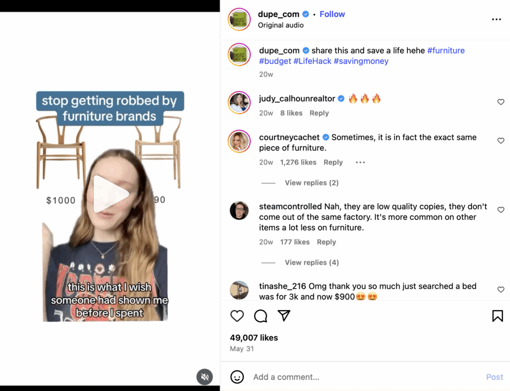 The Williams-Sonoma v. Dupe.com case fits squarely within this dynamic. According to Williams-Sonoma’s complaint, Dupe.com was not just selling similar-looking furniture (via its reverse image search aggregation tool); it was actively positioning itself as a truth-teller exposing the so-called “scam” behind luxury pricing.