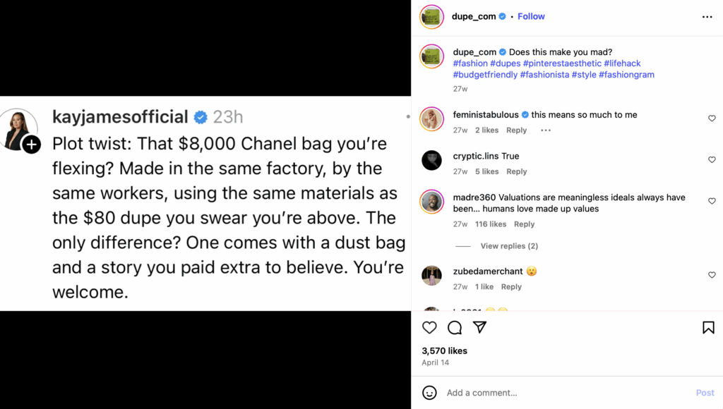 This narrative has taken hold with remarkable speed. One of the most viral examples came from purported factory-direct sellers in China, who took to TikTok in videos claiming to supply bags to houses like Hermès and Chanel – offering nearly identical versions to consumers at a fraction of the cost. Despite the lack of merit, the claims garnered millions of views and generated sales from enthusiastic consumers, successfully tapping into consumer frustration with rising price tags, sizable luxury markups and opacity around sourcing.
