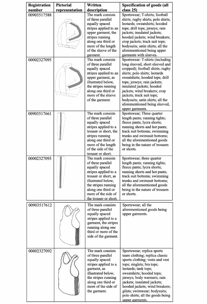 For example, one tracksuit-top registration required the stripes to run “one third or more” of a sleeve’s length, yet the illustration showed full-length sleeve stripes from collar to cuff – underscoring the gap between a broad written description and a single, non-limiting image. Such ambiguity, the court found, made it impossible for authorities or competitors to determine the scope of protection – and risked granting Adidas an undue competitive advantage.