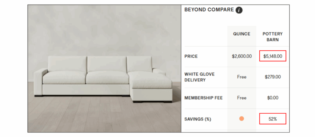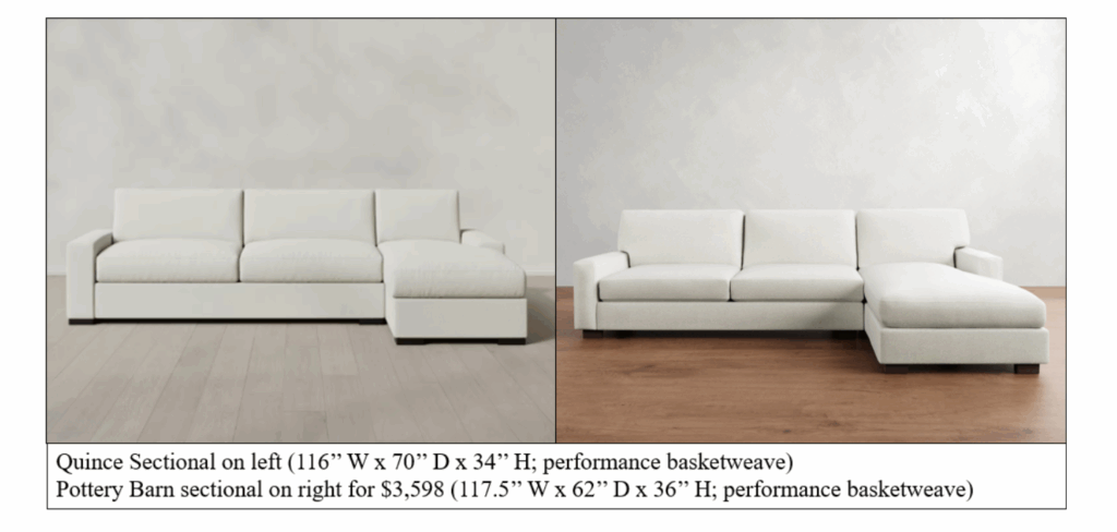 Even where Quince does offer a comparable item, the complaint continues, it “falsely states WSI’s prices” in order to exaggerate the purported savings. For example, WSI notes that “the most similar sectional sold by Pottery Barn actually costs $3,598 – not $5,148 as advertised by Quince.”