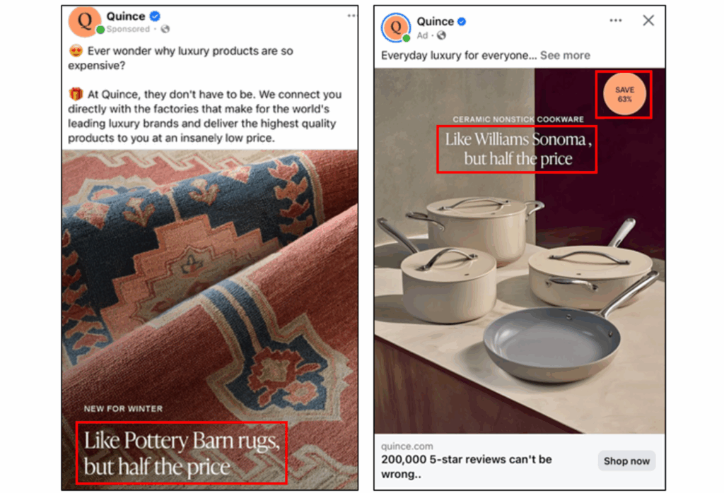 At the same time, WSI also highlights a series of social media ads and influencer-style promotions run by Quince across platforms like Instagram, TikTok, and Pinterest. In one such ad, a customer declares: “Like Pottery Barn rugs, but half the price” – even though the rug shown in the ad has never been sold by Pottery Barn, according to WSI. A similar ad touts a cookware set as being “like Williams Sonoma, but half the price,” again with no actual product correlation.
